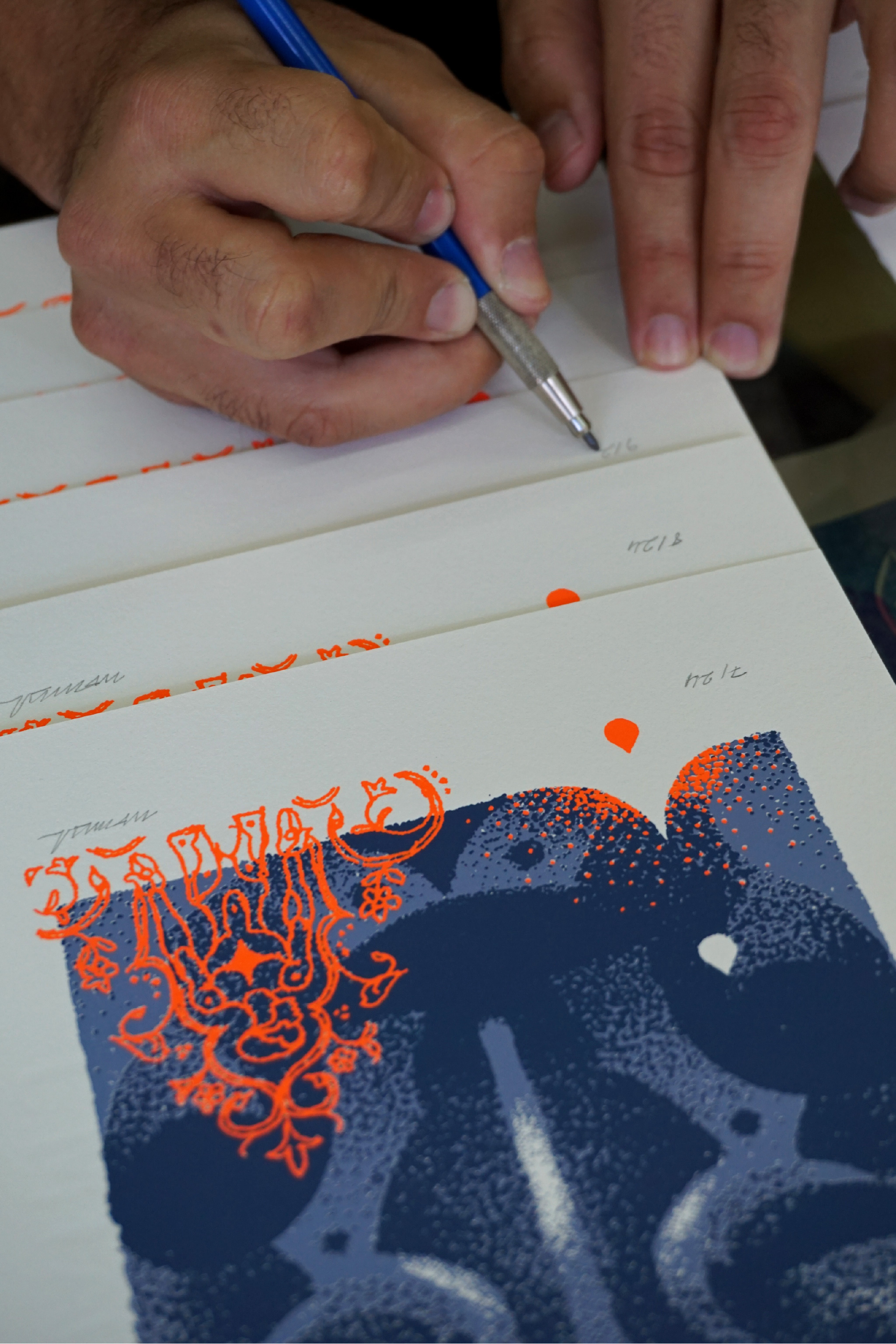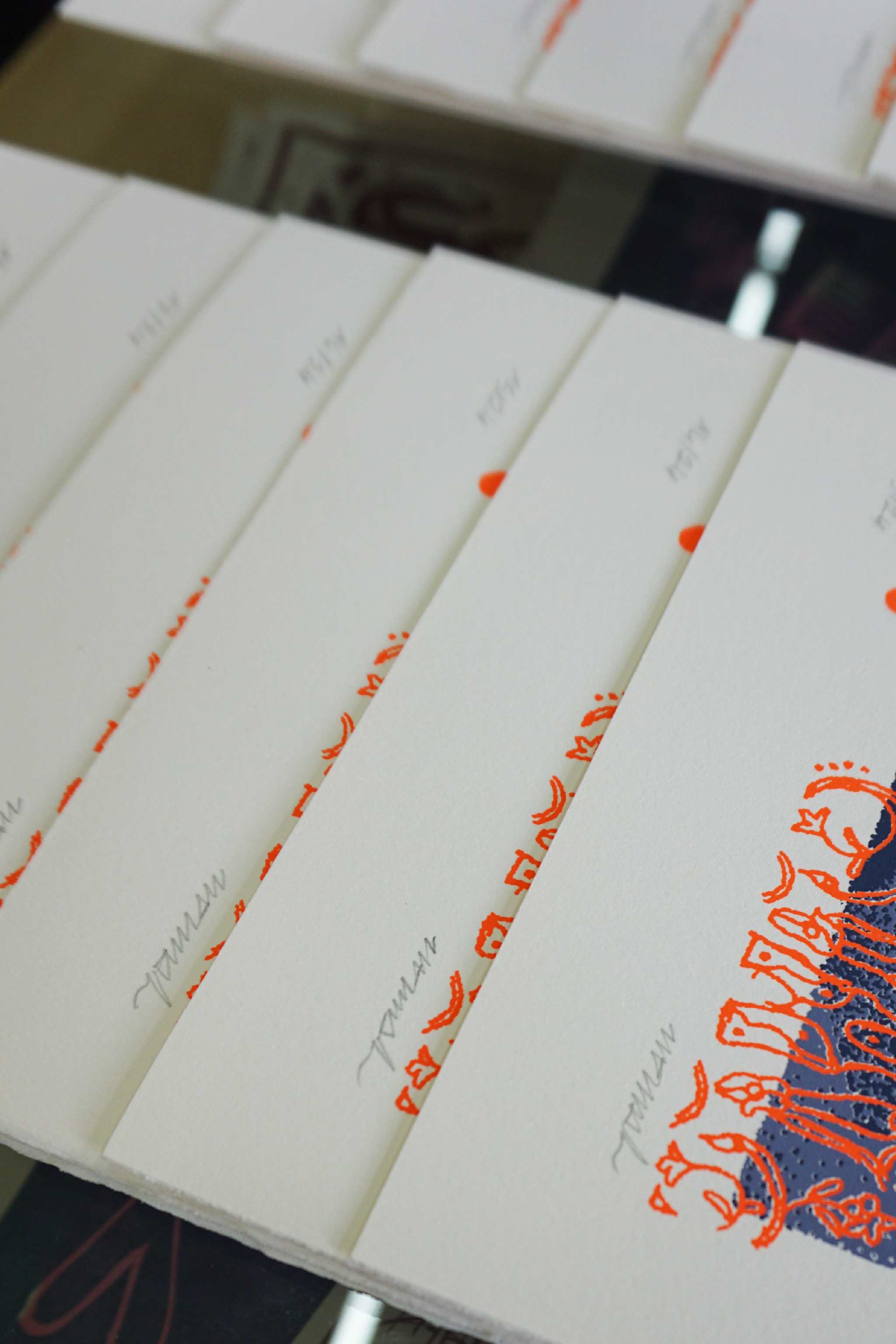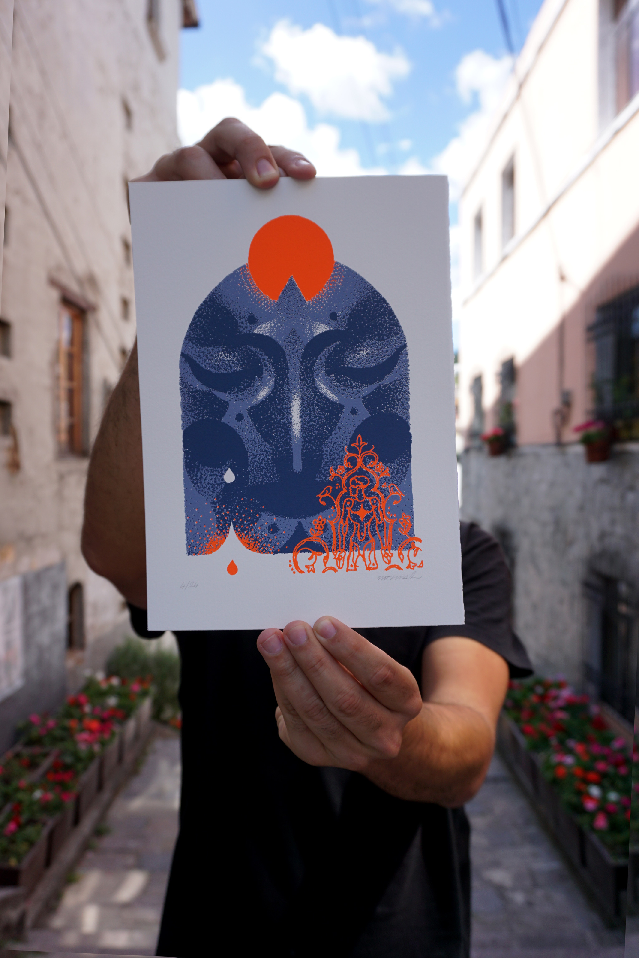Esta obra única tiene una corta edición de 24 copias y estan estampadas a 3 colores, sobre papel fabriano 100% algodón de 25x17.5 cm